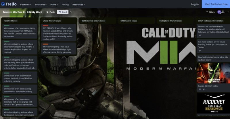 また、にアクセスすることもできます公式トレロページCall of Duty Modern Warfare 3ゲームについて、最近の問題に関する最新情報を確認してください。それとは別に、X(以前のTwitter)、Instagram、その他のそのようなWebサイトなどのソーシャルプラットフォームでのコールオブデューティハンドルに注目してください。