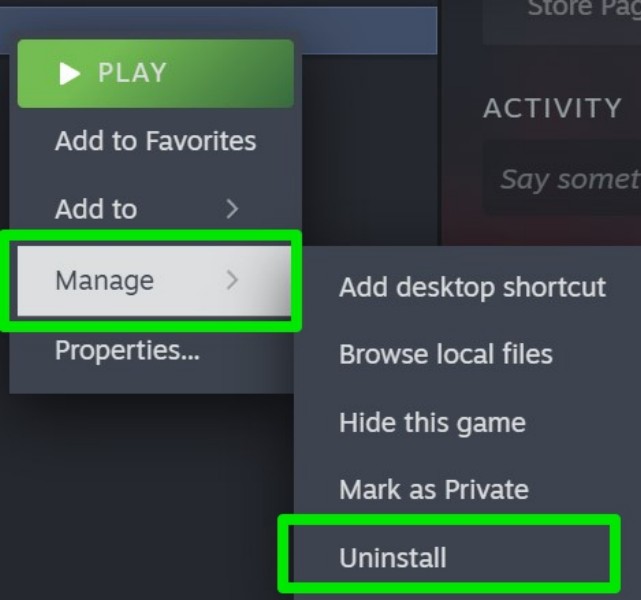 そうは言っても、WindowsデバイスにCOD MW 3ゲームを再インストールするには、最初にアンインストールする必要があります。したがって、Steamアプリを開き、ゲームライブラリに移動し、リストのCOD MW 3ゲームを右クリックして、アンインストールボタンの下オプションを管理しますコンテキストメニュー。次のプロンプトでアクションを確認して、PCまたはラップトップからゲームをアンインストールします。