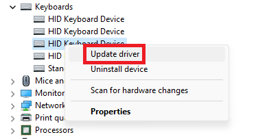 3。使用しているキーボードを右クリックして選択しますドライバーを更新しますオプション。