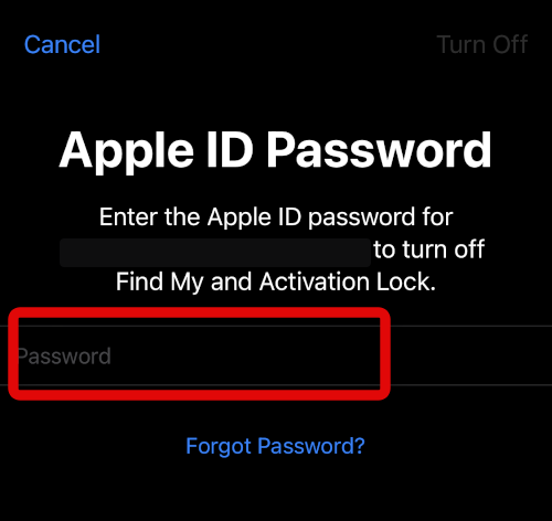 6。次に、AppleIDパスワードを入力してオフにします私を見つけてくださいあなたのiPhoneで。