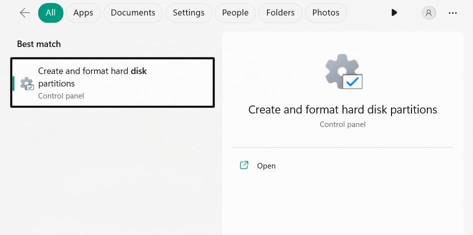1。開きますWindows検索ボックス、 タイプディスク管理、PCでアプリを開きます。