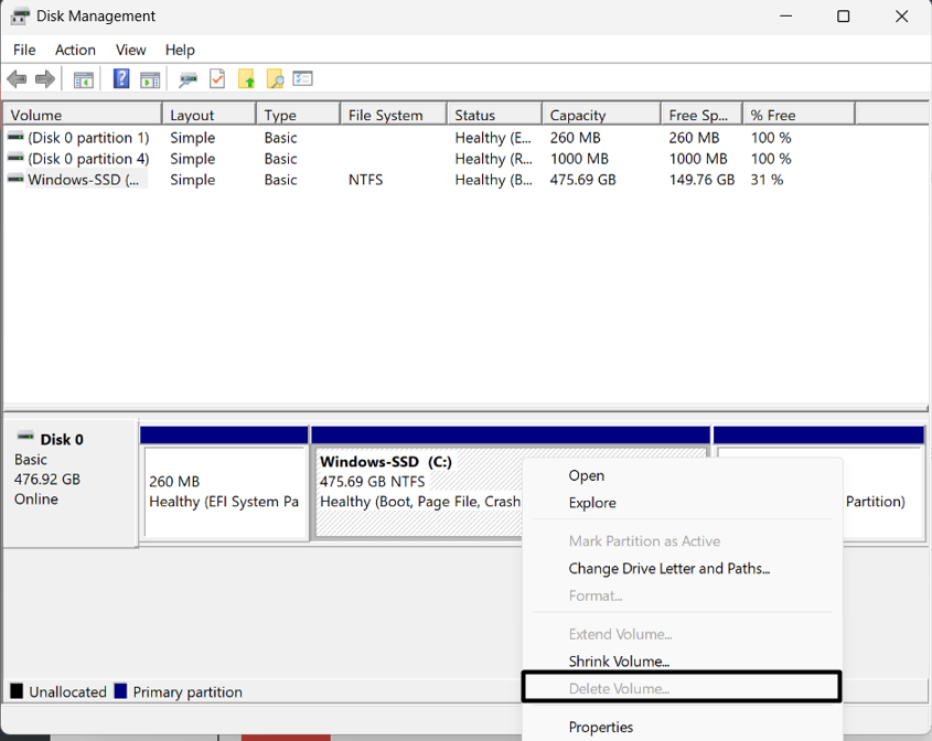 Windows11でグレーアウトしたボリュームオプションを拡張する別の方法は、ディスク管理プログラムのボリュームを削除します。そうすることで、Windows 11コンピューターからストレージドライブが削除されます。