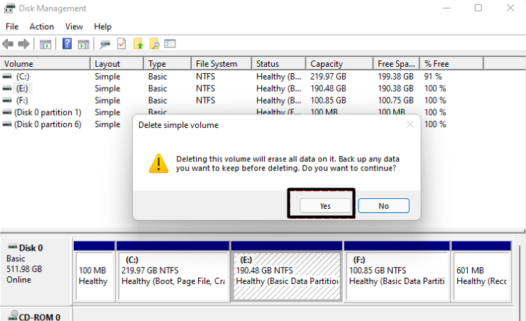 4。で簡単なボリュームを削除しますウィンドウ、選択はいこの選択したストレージドライブのすべてを削除します。
