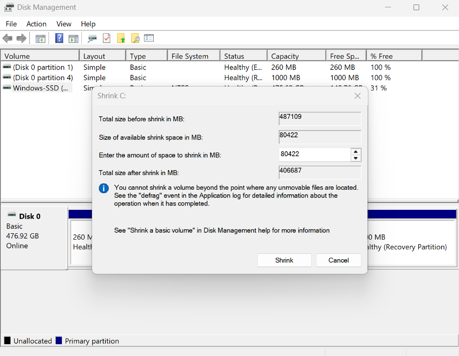 5。言及されたシュリンクサイズに従ってドライブを縮小し、問題のステータスを確認します。