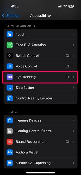 3。見つけてタップしますアイトラッキングオプション次のリストで。