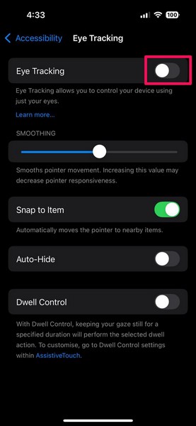 4。それから、トグルをタップしますの隣アイトラッキングオプションデバイスの機能を無効にするため。