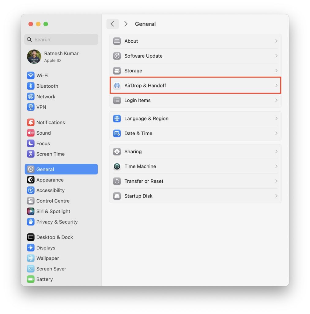 2。クリックしてください一般的なその後エアドロップ&ハンドオフ。
