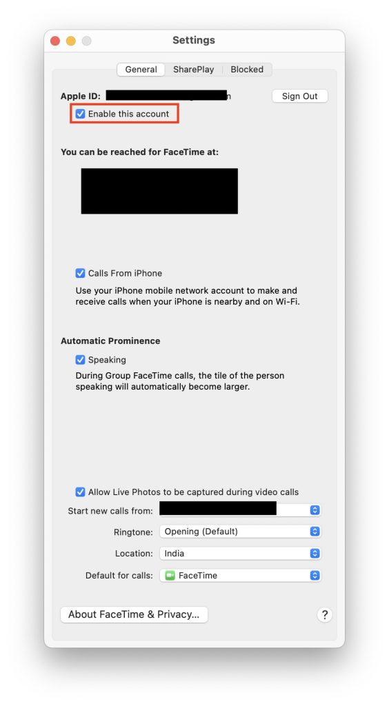 3。行きますFaceTime>設定その後、オプションをチェックしますこのアカウントを有効にします。