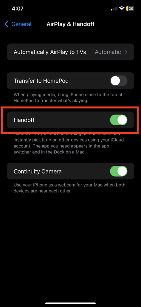 ハンドオフ機能を使用するには、設定アプリにアクセスしてiPhoneのハンドオフを有効にしてから、タップしてください一般的な>AirPlay&Handoffを使用して、ハンドオフ機能をオンにします。