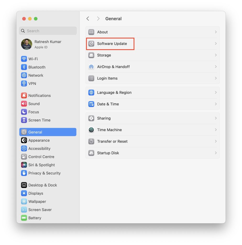 3。次の画面で、クリックしますソフトウェアアップデート。