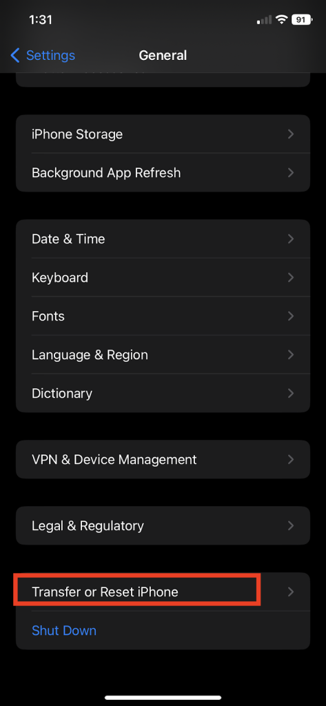 2。ずっと下にスクロールして、タップしますiPhoneを転送またはリセットしますそして、を選択しますリセットオプション。