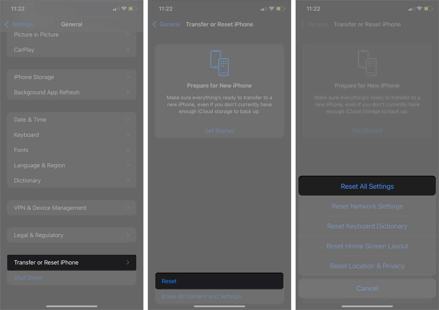 に向かいます設定→一般的な→iPhoneを転送またはリセットします。タップしますリセット、 それからすべての設定をリセットします。パスコードを入力して、タップしますすべての設定をリセットしますもう一度確認します。