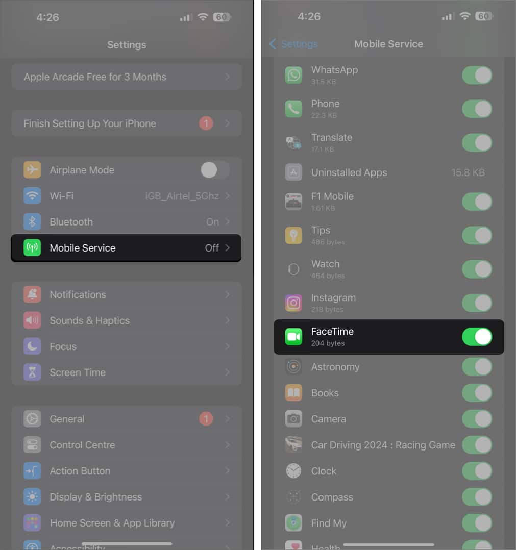 に移動します設定→アプリ→FaceTime。 FaceTimeを切り替えますオフ、再びオンに戻ります。