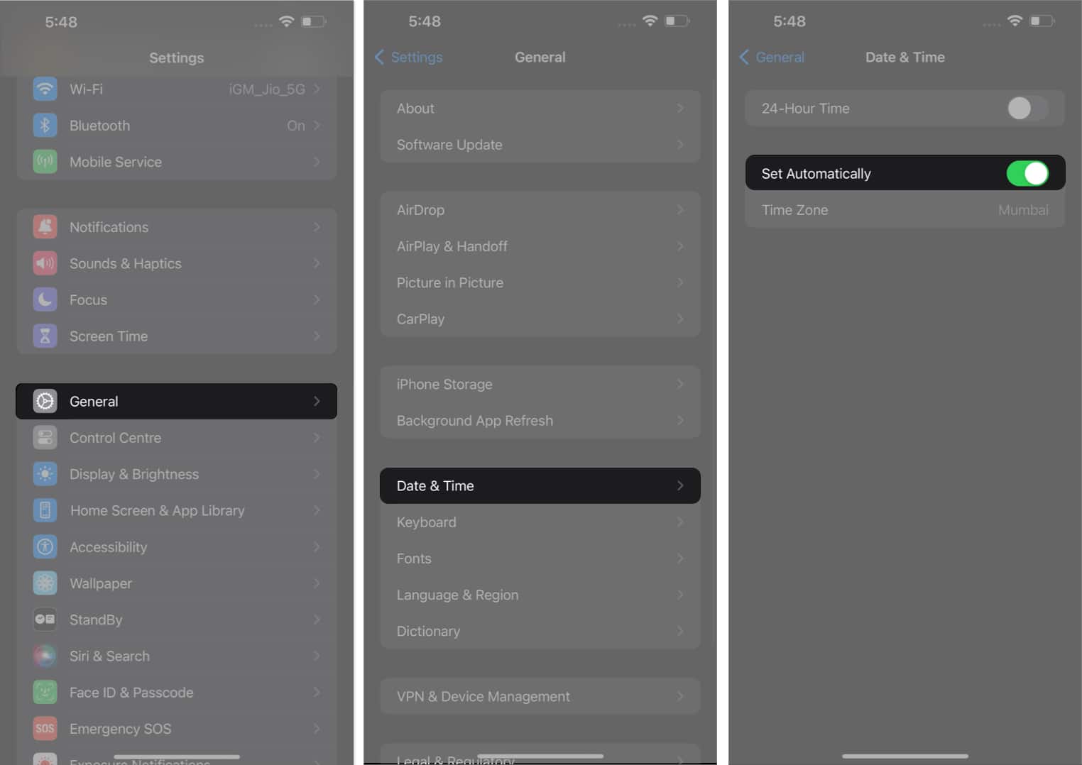日付と時刻を自動に設定するには、に移動します設定→一般的な→日付と時刻。トグル設定自動的に何度も。