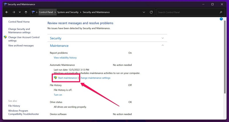 上記の方法でWindows 11のファイルエクスプローラーの問題を解決できなかった場合、Windows 11に右に構築されたシステムメンテナンスツールを試すことができます。システムメンテナンスツールは、一般的でありながらトリッキーな問題の一部をスキャンし、自動的に解決する気の利いたWindows機能です。