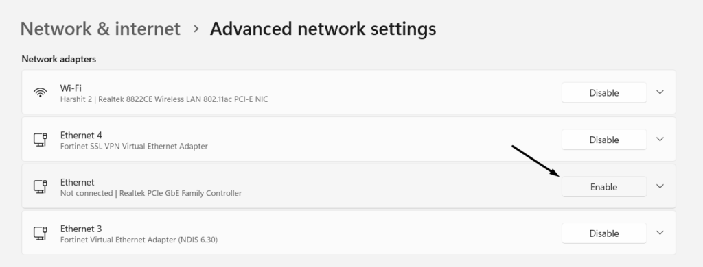 Windows 11 PCでイーサネットを介してインターネットを使用していて、なぜForticlient VPNが適切に機能していないのか疑問に思っている場合、イーサネット機能にいくつかの問題がある可能性があります。その場合、お勧めしますイーサネット関数をオンにします またPCで、問題を修正するかどうかを確認します。言及した手順に従って同じことをする: