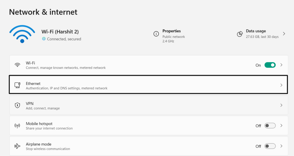 2。でネットワークとインターネットウィンドウ、選択イーサネットまたはWi-Fi現在使用しているものに応じて。