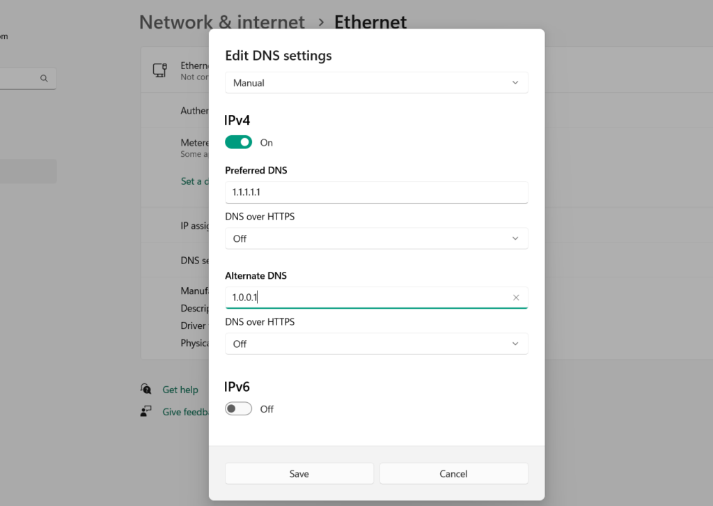 3。の隣にDNSサーバーの割り当て:、クリックします編集ボタンを選択して、を選択しますマニュアルオプション。