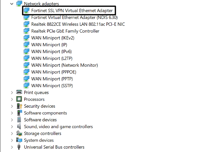 2。下ネットワークアダプター、 選ぶFortinet SSL VPN仮想イーサネットアダプター右クリックします。