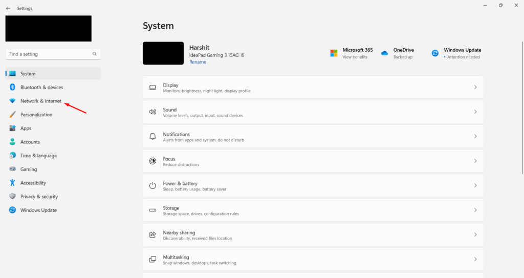 1。他の時間と同じように、開きます設定アプリシステムでクリックしますネットワークとインターネット左に。