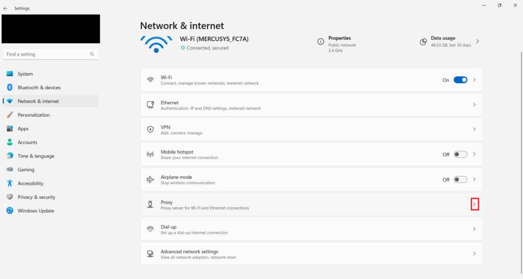2。で設定ウィンドウ、選択しますネットワークとインターネットそれの左側のサイドバーからのオプション。