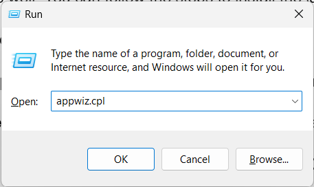 2。タイプappwiz.cplを押します入力を開く鍵プログラムと機能ウィンドウ。