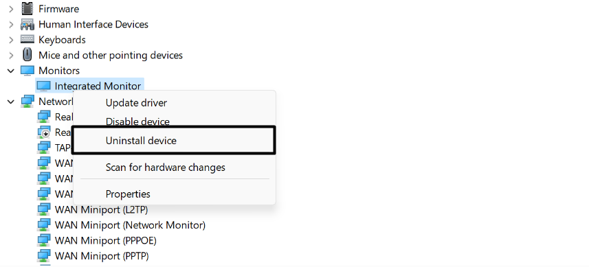 3。下のドライバーを右クリックしますモニター、そしてコンテキストメニューから、選択しますデバイスをアンインストールします。