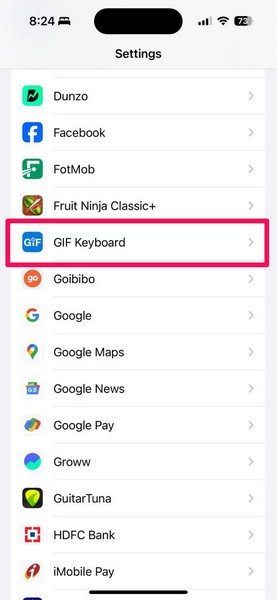 2。下にスクロールしますGIFキーボードアプリを見つけますリストにタップして開きます。
