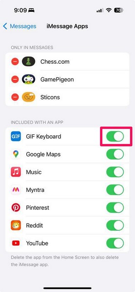 デバイスのiMessageアプリリストに表示できない場合は、使用してください。修正#2GIFキーボードアプリがiMessage設定で有効になっていることを確認します。
