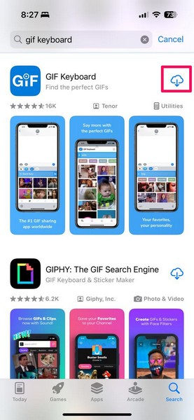 6。[検索結果]ページで、をタップしますダウンロードボタン(下矢印付きのクラウド)GIFキーボードアプリの隣には、再インストールします。