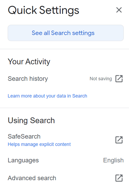 ステップ3:これで、ドロップダウンが開き、すべての検索設定を表示する必要があります。