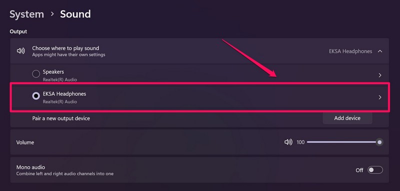 現在、ユーザーにヘッドフォンがWindows 11で機能していないと考えさせるもう1つの一般的なことは、オーディオ用に自動的に選択されていない場合です。 Windows 11でヘッドフォンまたはイヤホンを接続すると、システムがデフォルトのオーディオデバイスを接続されたヘッドフォンに切り替えるために「忘れる」ことがあります。