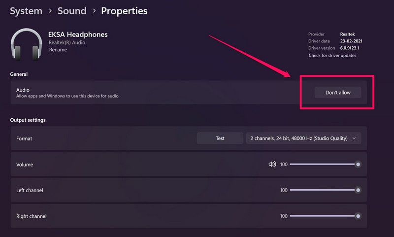 4。ここで、の設定を確認してくださいオーディオフィールドが表示されています許可しないでください。これは、ヘッドフォンがすでにWindowsやその他のアプリケーション用にオーディオを出力できることを意味します。