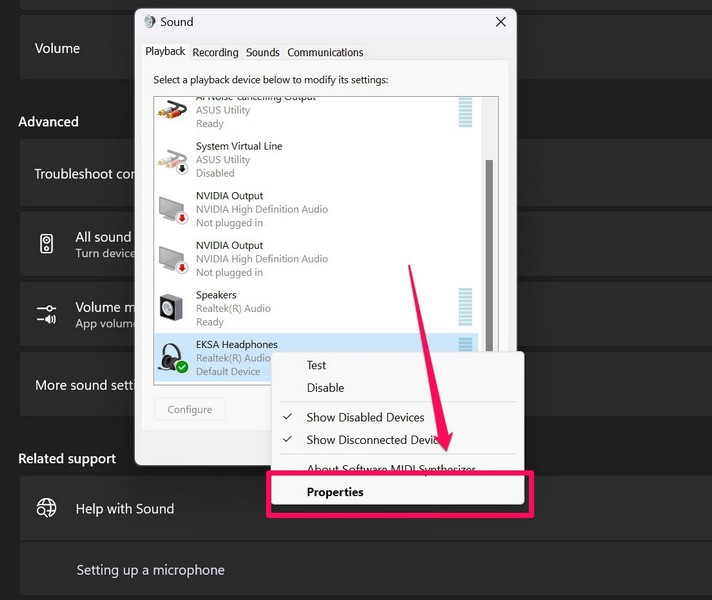 4。次に、リストからヘッドフォンを見つけてください。右クリックしますそれらに、そして選択しますプロパティコンテキストメニューから。