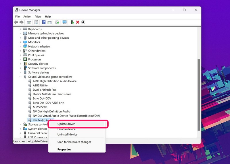 4。 オーディオドライバーを右クリックします選択しますドライバーを更新しますコンテキストメニューからオプション。