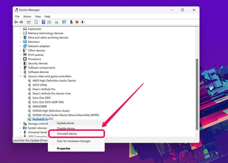 2。 オーディオドライバーを右クリックします選択しますデバイスをアンインストールしますオプション。