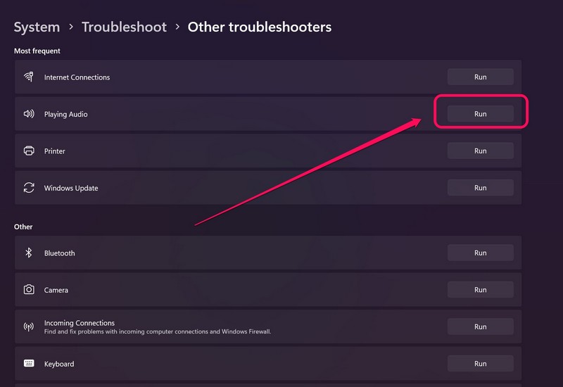 Windows 11の組み込みの演奏オーディオトラブルシューターを使用して、ラップトップまたはPCでオーディオの問題をスキャンおよび修正することを試みることができます。 Windows 11のトラブルシューティング設定で見つけることができます。