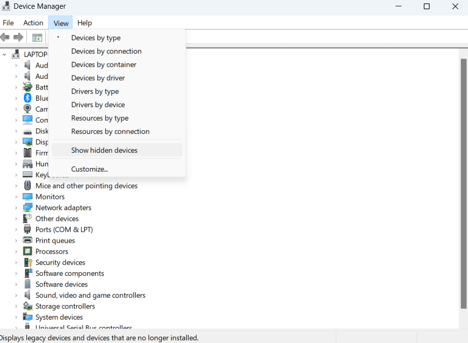 ステップ3 - いつデバイスマネージャ開いて、クリックしますビュークリックします隠されたデバイスを表示します。