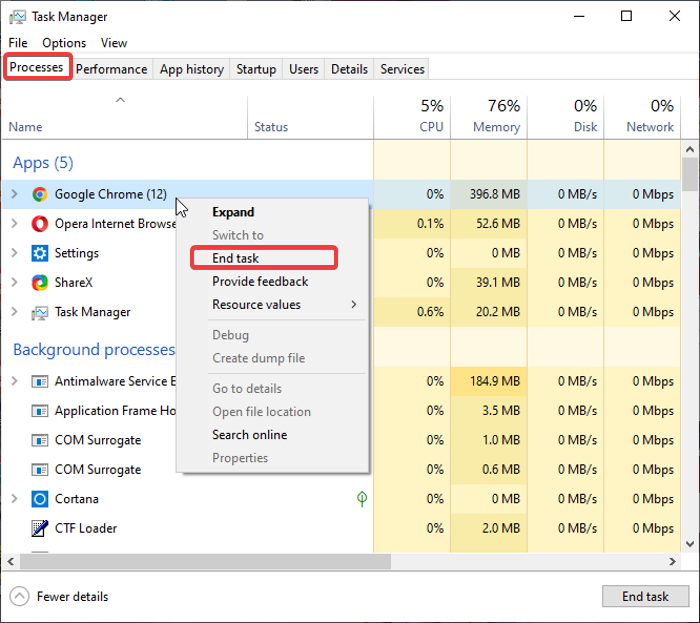 2。タスクマネージャーウィンドウで、閉じたいプログラムをクリックして選択しますタスクを終了します。