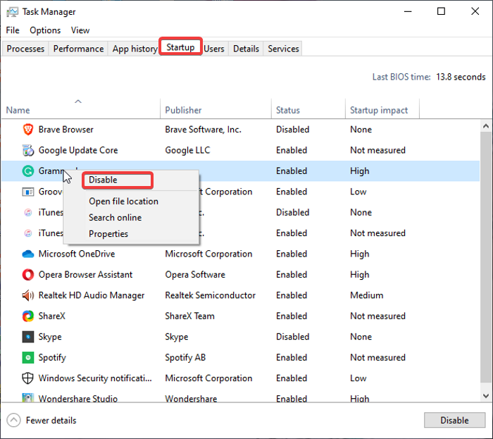 2。選択します起動するタスクマネージャーページで、無効にするプログラムを右クリックします。