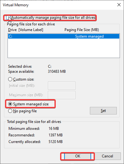 5。untickすべてのドライブのページングファイルサイズを自動的に管理します、ハードドライブを選択して確認しますシステムマネージドサイズボックス。その後、クリックしますわかりました。