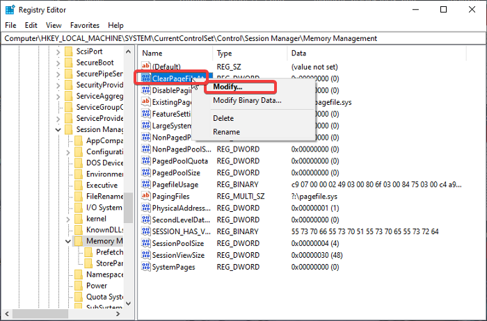 4。メモリ管理フォルダーで、右クリックしますClearPageFileatshutdown選択します修正する。