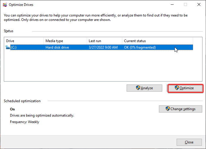 3。デフラグしたいハードドライブをクリックしてヒットします最適化する画面の下部に。