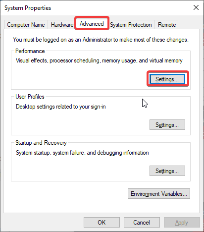 3。次に、に切り替えます高度な結果のウィンドウのタブとクリックします設定パフォーマンスセクションの下。