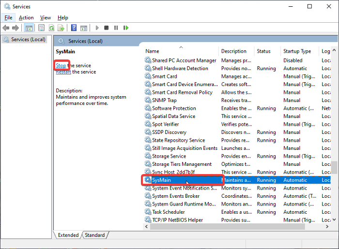 3。に移動しますSysmain(SuperFetch)サービスリストでクリックします。次に、選択します停止サービスを終了します。