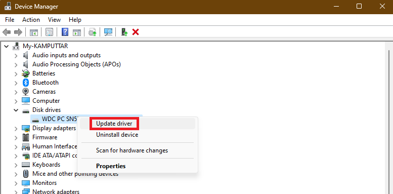 - ポップアップメニューで[ドライバーの更新]オプションを選択します。