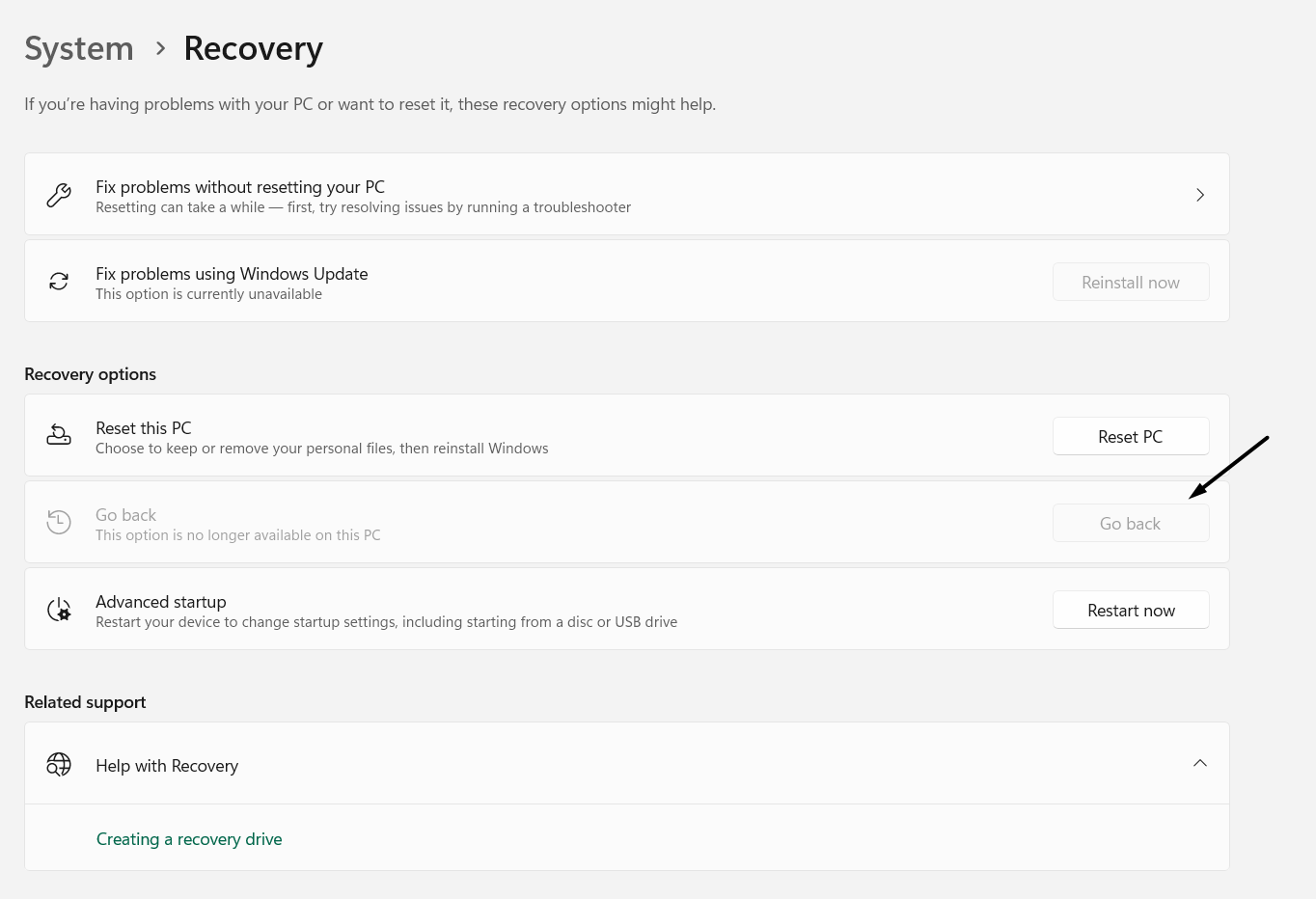 ただし、Go Backオプションは、PCが古いWindowsファイルを削除していない場合にのみ使用できます。したがって、以下の手順に従って、Go Back関数がコンピューターで使用可能かどうかを確認し、次を使用します。