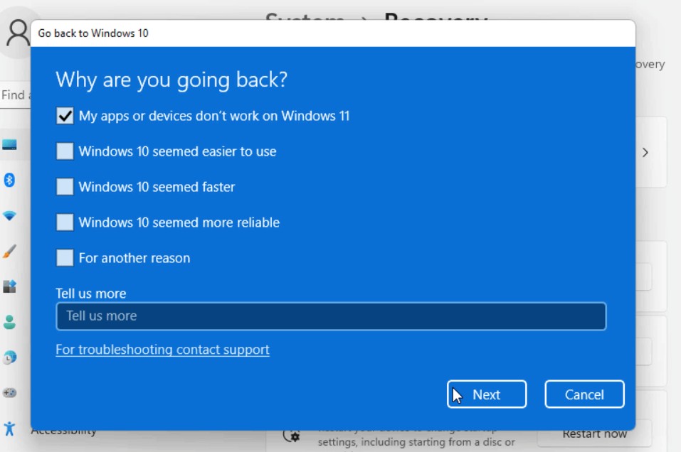3。でなぜ戻るのですか?ウィンドウは、PCをWindows 10に戻す理由を選択します。