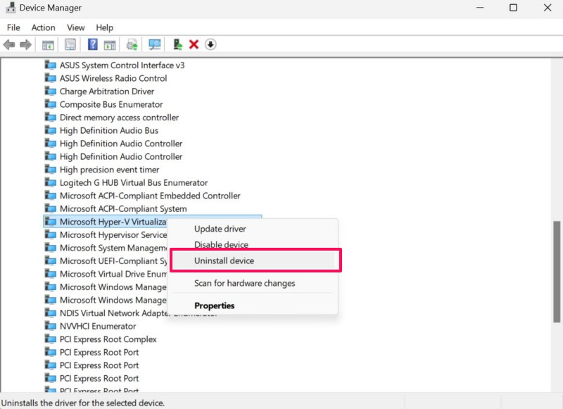 2。 右クリックしますにMicrosoft Hyper-V仮想化インフラストラクチャドライバーオプションとヒットオプションをアンインストールしますコンテキストメニュー。