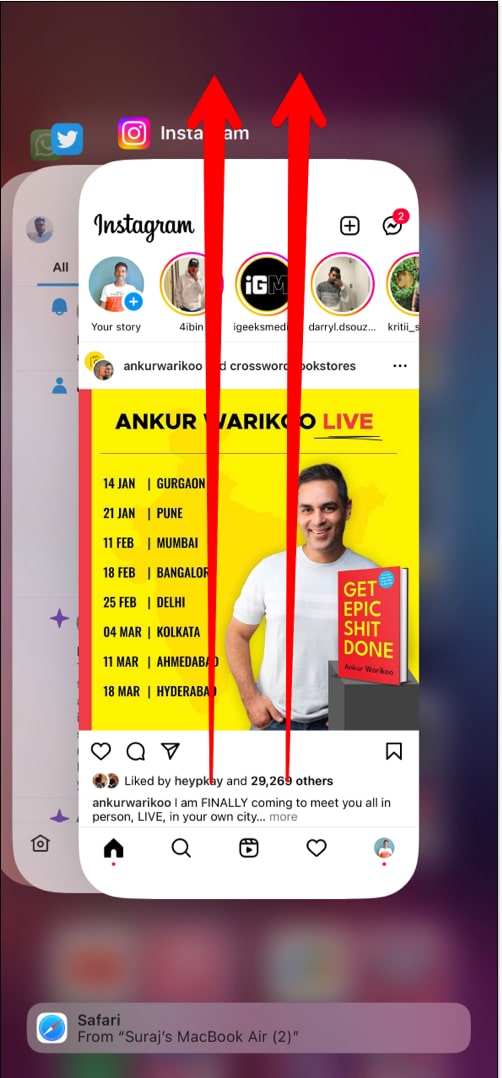 したがって、スワイプしてホーム画面から保持して、アプリスイッチャーを開きます。次に、Instagramと一緒にアプリを削除します。これにより、アプリはバックグラウンドアクティビティを停止させます。数秒後、アプリを再び開き、問題が解決したかどうかを確認します。